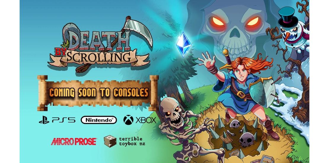 El caótico ascenso por escapar del más allá continúa cuando Death By Scrolling llegue a consolas el próximo 16 de abril, con un lanzamiento simultáneo en Xbox, PlayStation y Nintendo Switch. El estreno en consolas coincidirá con una importante actualización para la versión de PC, que incorporará nuevo contenido y mejoras de calidad de vida en todas las plataformas.