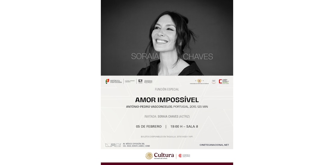 En colaboración con la Embajada de Portugal en México, la Cinemateca Portuguesa y Camões-Instituto da Cooperação e da Língua, y con motivo de las celebraciones por los 160 años de las relaciones diplomáticas entre Portugal y México, Cineteca Nacional México prepara proyección especial de la película Amor Impossível (2015), dirigida por el cineasta portugués António-Pedro Vasconcelos.