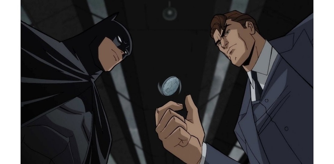 El primer trailer de Batman: The Long Halloween Part 1 comienza con Batman y Harvey Dent frente a una enorme pila de dinero, con un lanzamiento de moneda que presagia el eventual descenso de este último a la villanía.