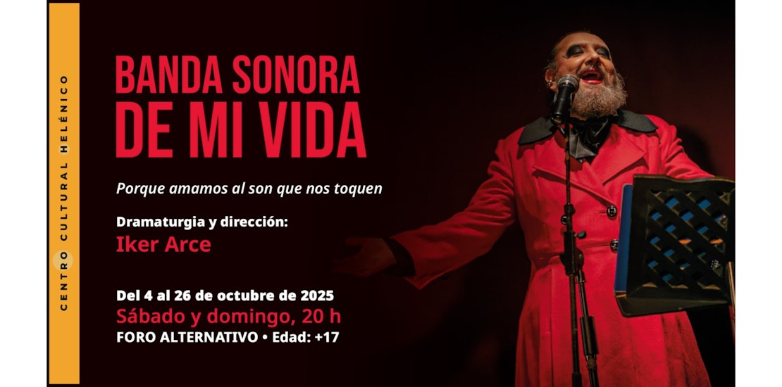 ¿Quién no ha suspirado con una balada de Juan Gabriel o derramado lágrimas al ritmo de un desamor? Banda sonora de mi vida es un unipersonal de cabaret que desfragmenta las ideas románticas y confronta las nociones idealizadas que las canciones populares han arraigado en nuestras vidas. Escrito, dirigido y protagonizado por Iker Arce, esta puesta en escena se presentará del 4 al 26 de octubre de 2025 en el Foro Alternativo del Centro Cultural Helénico.