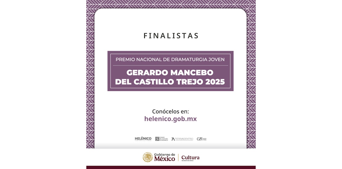 La Secretaría de Cultura, a través del Centro Cultural Helénico, la Compañía Nacional de Teatro y el Fondo de Cultura Económica, anuncia a los finalistas del Premio Nacional de Dramaturgia Joven Gerardo Mancebo del Castillo Trejo 2025, una iniciativa dirigida a dramaturgas y dramaturgos de entre 20 y 29 años de toda la República mexicana. Este premio celebra 25 años de trayectoria y se consolida como un certamen único en su tipo, por su impulso al pensamiento escénico joven en el país.