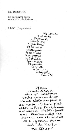 Li-Po y otros poemas se inspira en el poeta chino del siglo VIII, quien, se cuenta, murió ahogado cuando estando borracho quiso alcanzar la luna reflejada en un lago. En el libro se pueden leer y apreciar poemas que forman lunas, puñales, aves y hasta herramientas de trabajo.