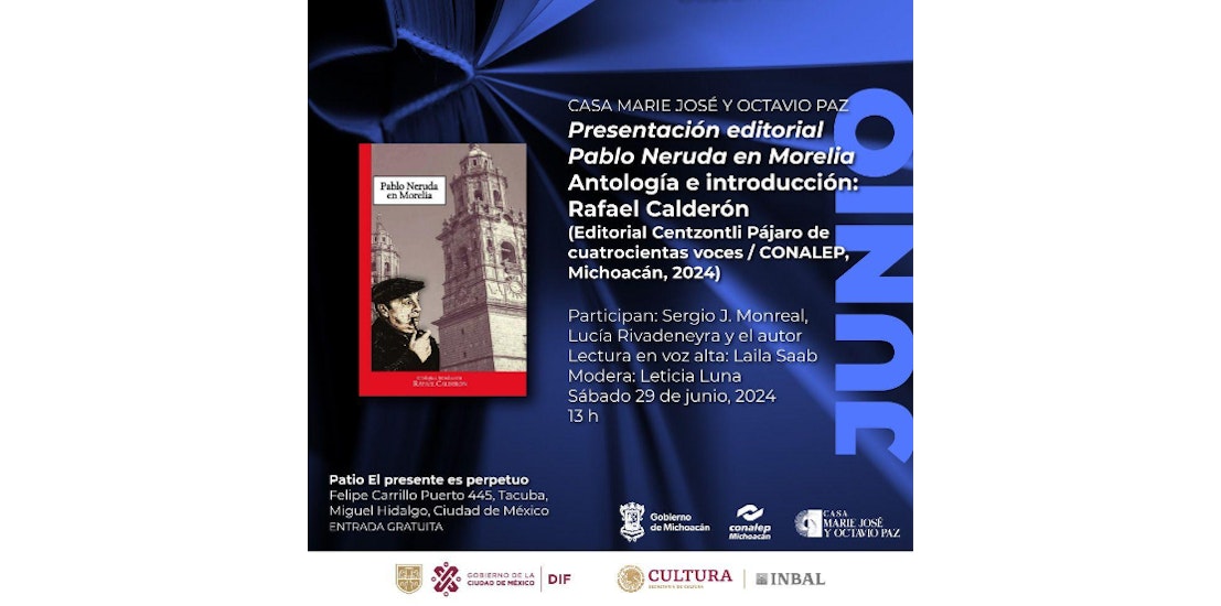 La presentación del libro Pablo Neruda en Morelia (Editorial CentzontliPájaro de Cuatrocientas Voces / CONALEP Michoacán, 2024) se llevará a cabo el sábado 29 de junio de 2024, a las 13:00 h, en la Casa Marie José y Octavio Paz (Felipe Carillo Puerto 445, colonia Tacuba, alcaldía Miguel Hidalgo, Ciudad de México). La entrada es gratuita.