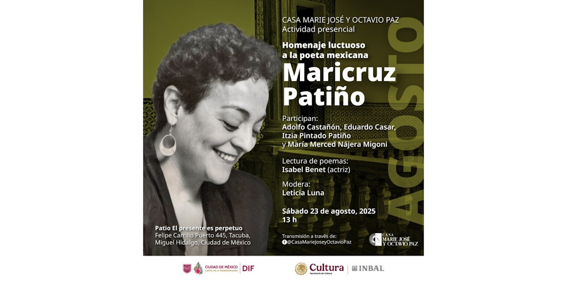 El homenaje luctuoso a la poeta Maricruz Patiño (1950-2025) se llevará a cabo el sábado 23 de agosto de 2025, a las 13 h, en la Casa Marie José y Octavio Paz (Felipe Carillo Puerto 445, colonia Tacuba, alcaldía Miguel Hidalgo, Ciudad de México).